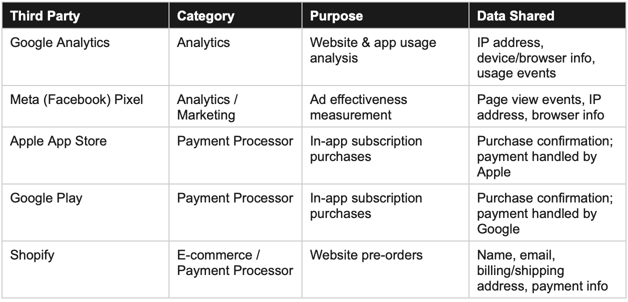 Google Analytics: We use Google Analytics to understand how visitors use our website and app. Google Analytics uses cookies to collect data including your IP address, browser type, pages visited, and session duration. This data is aggregated and used to improve our Services. You can opt out by installing the Google Analytics Opt-out Browser Add-on (available at tools.google.com/dlpage/gaoptout) or by enabling the Do Not Track signal in your browser.