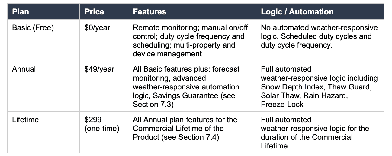 “Services” means the proprietary weather-monitoring, automation logic, energy optimization algorithms, and related software services provided through the App, including but not limited to forecast monitoring, Snow Depth Index tracking, Thaw Guard, Solar Thaw, Rain Hazard detection, Freeze-Lock protection, and remote device control.